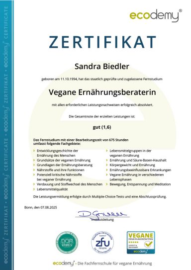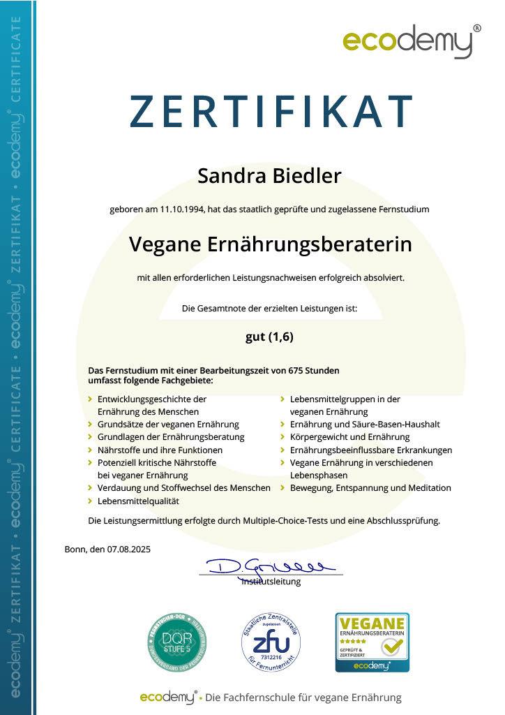 • zertifizierte vegane Ernährungsberaterin (Ecodemy)